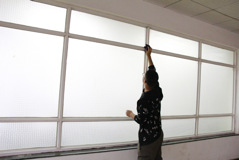图为学生正在擦窗户  摄影:陈爱媛