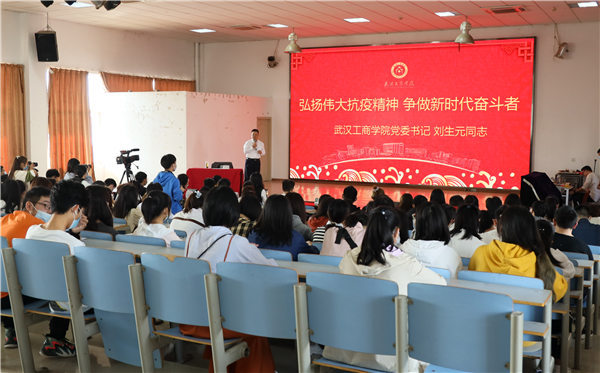 刘生元书记以《弘扬伟大抗疫精神,争做新时代奋斗者》为主题,分别围绕“抗疫彰显中国制度优势”“抗疫中的人民英雄”“凝聚众志成城的武工商力量”“当代青年学生的责任与担当”四方面作了详细阐述,带领同学们回顾抗疫的那段艰难时光,激发爱党、爱国、爱社会主义的热情,引领树牢“四个意识”、坚定“四个自信”、做到“两个维护”,与新时代同频共振,立鸿鹄志,做奋斗者。