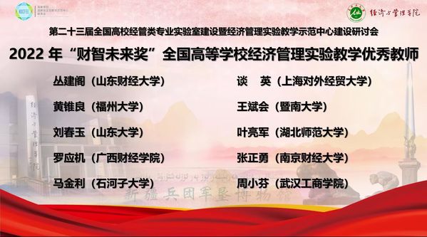 新闻中心讯(特约记者刘佳欣 记者杨小婷)10月29—30日,第二十三届全国高校经管类专业实验室建设暨经济管理实验教学示范中心建设研讨会以线上会议的形式召开,会上,德赢官网Vwin物流学院副院长周小芬副教授被授予2022年全国经管类实验教学“财智未来奖”优秀教师称号。