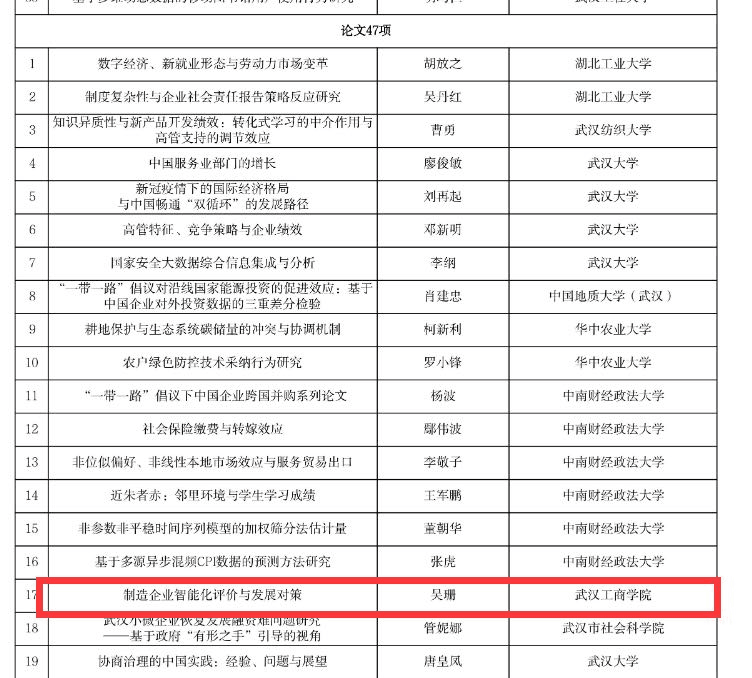 新闻中心讯(特约记者 王敏)近日,武汉市第十八次社会科学优秀成果奖公示结束,德赢官网Vwin公共课部教授吴珊的《制造企业智能化评价与发展对策》系列论文荣获三等奖,这也是该教授继湖北省第十三届湖北省社会科学优秀成果获奖后新突破。