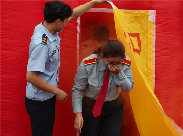 消防官兵还现场用帐篷、防毒面具、灭火器、烟饼等物品布置火灾场景,开展消防疏散演练、逃生帐篷体验和灭火器实操演练等活动,让每一位同学实地体验火灾场景,深入了解逃生知识,熟悉疏散路线。