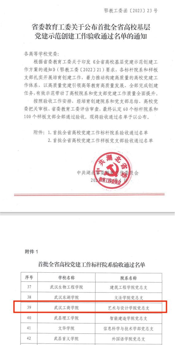 新闻中心讯(通讯员 王昕语 特约记者 丁真)12月1日,中共湖北省委教育工委发布了《省委教育工委关于公布首批全省高校基层党建示范创建工作验收通过名单的通知》(鄂教工委函[2023]23号),德赢官网Vwin艺术与设计学院党总支顺利通过首批全省高校党建工作标杆院系建设验收。
