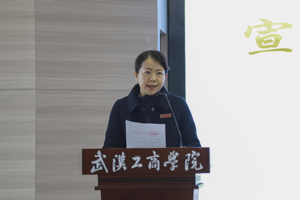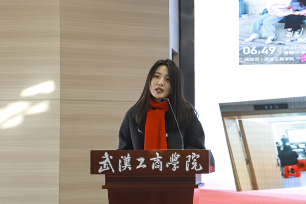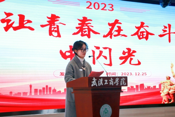 文法学院学生杨培作为优秀学生代表发言,向大家分享了自己在校电视台、大学生记者团以及宣传策划部的实践经历和感悟,她说:“在校园媒体工作的经历不仅增强了我的专业本领,也让我认识了学校很多优秀的老师、同学,她们的奋斗故事时刻激励着我要怀抱梦想,脚踏实地,让青春在奋斗中绽放绚丽之花。”她呼吁同学们要将个人理想融入新时代新征程,珍惜时光,努力奋斗,在新时代的“赶考”路上,续写武工商青年的青春奋斗故事!