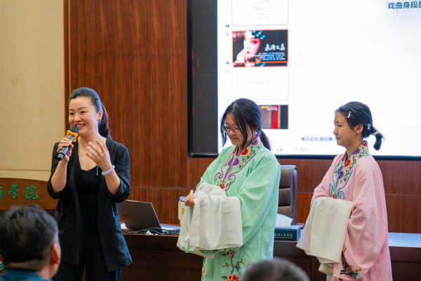 谈及《女驸马》,程丞指出,女主角冯素珍凸显了古代才女的“人性”智慧和胆识,是融合忠贞、才华、勇气与智慧的理想化女性形象,完美诠释了“巾帼不让须眉”的精神内核。期间,她还邀请学员共同合唱该剧经典唱段《为救李郎离家园》,并进行赏析讲解,让学员更直观地感受角色魅力。