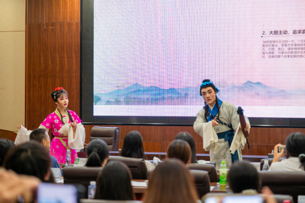 为了让学员们现场感受黄梅戏经典剧目的独特魅力,青年演员张斯诺、闵玉馨还在台上惊艳亮相,精彩演绎了《天仙配》中“拦路表白”的经典片段,引得台下掌声雷动。