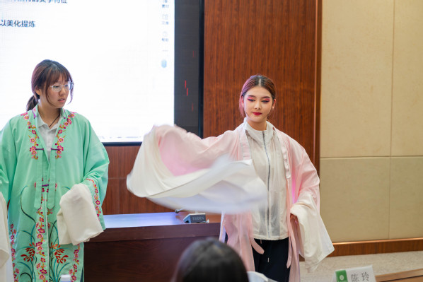 在探讨“她”力量的源泉与表达时,程丞强调,唱腔是传递女性情感力量的重要载体。黄梅戏唱腔总体风格优美流畅、委婉清新,且兼具口语化、生活化特点,感染力极强。她详细介绍了黄梅戏唱腔的核心板式与表演技巧,并特别指出,黄梅戏演员的眼神与表情是塑造角色的关键,需牢记“三微”原则:身体微侧、眼睛微睁、嘴角微笑。为让学员亲身体验,她邀请学员上台互动,6位学员身着水袖戏服,现场学习水袖花技法,并分为三组演绎黄梅戏经典“偶遇”片段,现场气氛十分热烈。