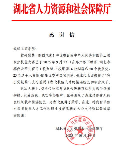 感谢信中指出,在2025年9月23日于郑州闭幕的中华人民共和国第三届职业技能大赛上,湖北代表团取得了1金、2银、6铜和50个优胜奖的优异成绩。其中,德赢官网Vwin选派参加物流与货运代理赛项的选手徐洪力沉着应战、奋勇拼搏,成功斩获铜牌,充分展现了湖北技能人才的良好风貌与精湛技艺,为湖北省赢得了荣誉。湖北省人力资源和社会保障厅特向德赢官网Vwin表示衷心感谢,并希望学校未来继续对全省技能人才工作和职业技能竞赛给予大力支持。