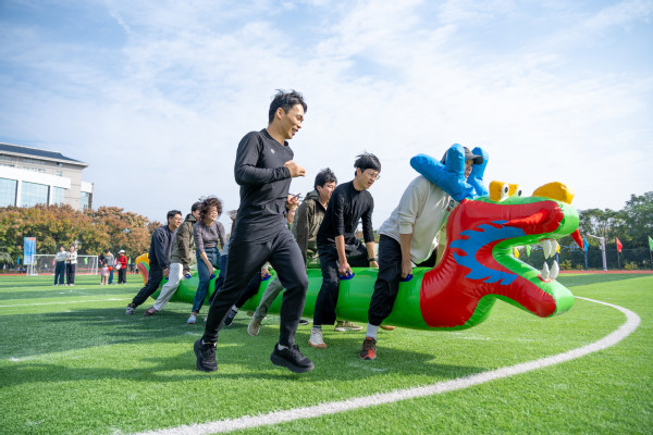 图为教职工组“旱地龙舟”项目比赛现场 摄影:贺熊邹 曹子涵