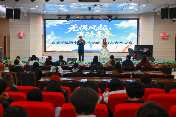 本届大赛以“无惧风起,声动青春”为主题,共吸引了全校67名学生参加,经过初赛、复赛的层层选拔,来自各二级学院的6名选手脱颖而出晋级决赛。决赛评委团由文法学院分团委书记肖隽,网络与新媒体系主任张莹、教师管一凡,新闻系教师方秋月,以及校电视台、广播台、艺术团、往届“金话筒”主持人大赛获奖者等优秀学生代表共同组成。
