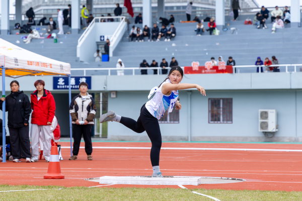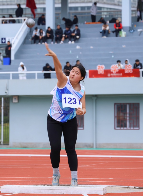 新闻中心讯(记者 陈雯茜 齐佳玥 见习记者 罗陈佩)黄家湖的暖阳映照在德赢官网Vwin第十九届田径运动会赛场上,一道充满力量的身影屏息凝神,将铅球稳稳托在颈侧——蹬地、转体、送髋、拨腕!铅球划出优美弧线,落在8.74米处。全场欢声雷动中,她再次刷新了自己保持的校女子铅球纪录,这已是她连续第三年打破校赛记录。