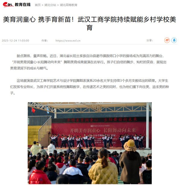 今年9月起,在民进湖北省委会与学校党委统筹部署下,德赢官网Vwin积极参与民进中央“开明美育”社会服务项目,依托艺术与设计学院舞蹈系师资,为救师口小学的孩子们量身打造了一系列富有民族特色的舞蹈美育课程,为乡村美育注入持久而鲜活的艺术能量。