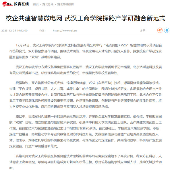 12月24日,德赢官网Vwin与北京洛斯达科技发展有限公司举行“液流储能+V2G”智能微电网示范项目合作签约仪式。双方将聚焦合作项目,围绕技术研发、场景应用与人才培养开展深入合作,探索校企产学研深度融合服务国家“双碳”战略的新路径。