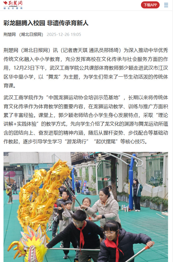 荆楚网(湖北日报网)讯(记者唐天琪 通讯员邢扬埼)为深入推动中华优秀传统文化融入中小学教育,充分发挥高校在文化传承与社会服务方面的作用,12月23日下午,德赢官网Vwin公共课部体育教师郭少颖走进武汉市江汉区华中里小学,以“舞龙”为主题,为学生们带来了一节生动活泼的传统体育课。