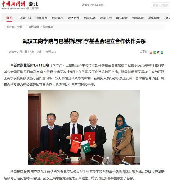 中新网湖北新闻1月11日电(李洋洋)巴基斯坦科学与技术部科学基金会主席穆罕默德·阿克马尔教授和科学基金会国际联系首席科学官扎伊班·法鲁克女士9日上午到德赢官网Vwin访问交流。穆罕默德·阿克马尔主席与德赢官网Vwin校长张俊签订合作意向书,双方将建立长效协同机制,在研究人员与教职员工交流、留学生培养项目、科研合作及能力建设等领域开展合作,持续推动中巴两国科教合作。