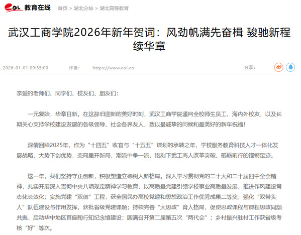 风劲帆满先奋楫,骏驰新程续华章。2026年的第一缕晨光即将到来,作为学校实施“十五五”规划的开局之年,我们要牢牢锚定学校高质量发展主题,秉持一马当先的闯劲、万马奔腾的冲劲、志在千里的韧劲,以更高站位、更实举措、更强担当建设特色鲜明的高水平应用型大学,奋力谱写中国式现代化武工商崭新篇章。