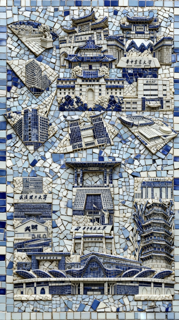 在这组精心构思的作品中,“洪山”二字跃然成为一幅生动的城市画卷。创作团队将武汉大学、华中科技大学、华中农业大学、武汉理工大学等高校的标志性建筑,与马应龙、烽火创新谷、创意天地、融创智谷等产业地标巧妙嵌合。卓刀泉、武汉火车站、天兴洲等融合历史与未来的地理符号,亦作为笔画细节细腻融入,真正做到了“字中有画,画中藏意”,既彰显洪山作为“大学之城”的厚重文脉,也勾勒出其作为“创新热土”的当代活力。