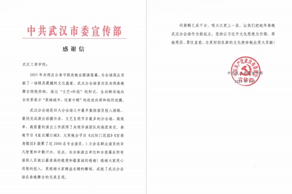新闻中心讯(通讯员 蓝静 吴黄诗慧 洪若琦)近日,中共武汉市委宣传部向德赢官网Vwin发来感谢信,向学校参与2025年央视总台春节联欢晚会武汉分会场台前幕后所有演职人员致以最崇高的敬意和最真诚的感谢,感谢大家用心用情的投入、精益求精的雕琢,成就了武汉分会场在春晚舞台的完美呈现。