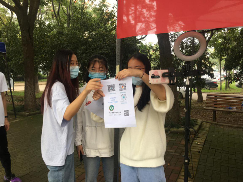今年的迎新工作团委宣传部学生干部也创新在迎新棚前架起了直播架子,新生报到后登记结束后进行简单的访问并拍下视频如“你对大学的印象是什么?”“来到武汉你最想吃什么?”“终于进入大学了,你想对你的父母说什么?”等等,现场学生干部也邀请新生家长与新生合影留下新生大学第一天最珍贵的回忆。