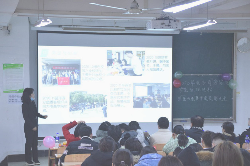 新闻中心讯(记者 刘旭光)12月14日中午12时10分,电子商务学院学生组织述职暨年度表彰大会在综合楼206顺利举行,此次大会旨在增强组织内部团结、明确职责,为电子商务学院贡献自己的力量。电子商务学院党总支书记杨睿、常务副院长魏华、教学副院长万辉、分团委书记舒娟、教学秘书李珊珊、18级辅导员苏晓宇、19级辅导员欧阳晓晶、20级辅导员刘芳莅临会议现场,同时全体学生组织成员和部分学生代表参加此次大会。大会由龚豫帆、候伟亮主持。