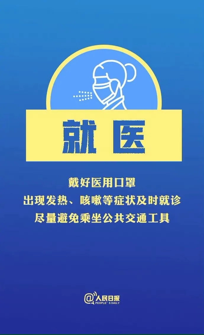 出现发热、咳嗽、腹泻、乏力等症状时,要佩戴一次性医用外科口罩,及时到就近发热门诊就诊,就医过程中尽量避免乘坐公共交通工具。