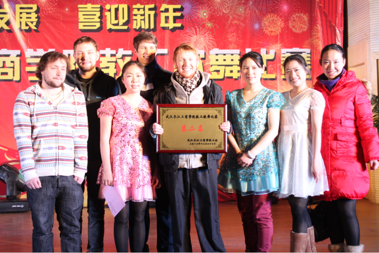 当日,全校教职工以优美的舞姿和动听的歌声演绎了一场节日盛典。歌舞会的高潮由我校国际教育学院的4名外教的改编歌曲带来。来自不同国家的外教Michael、Bryan、Ben、Chris一起为我们带来了一首动听的《Time of the life》来表达他们对我校师生的节日祝福。Bryan的大鼓,Ben的吉他,Michael的贝斯,还有Chris开场祝福,使得现场师生掌声连连,现场学生“粉丝”激动地大呼“I love you”。精彩的歌曲演唱之后,Bryan和Chris还参与了国际教育学院组织的交谊舞。整场舞蹈采取中西结合形式,融入中国的民族风味和西方舞蹈风格,如相互交换舞伴等。四对男女教师舞步规范,潇洒自如,灵活稳健,造型新颖别致,赢得了在场师生、评委的一致好评。经过激烈的竞争,国际教育学院荣获此次比赛表演第二名。