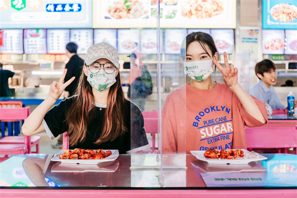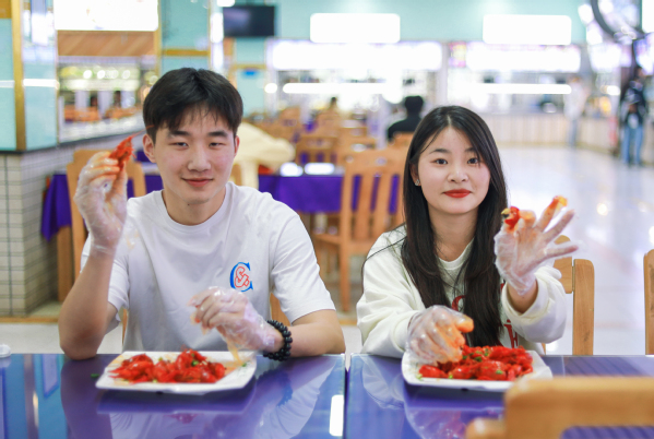 图为学生在食堂开心品尝小龙虾 摄影:张誉东