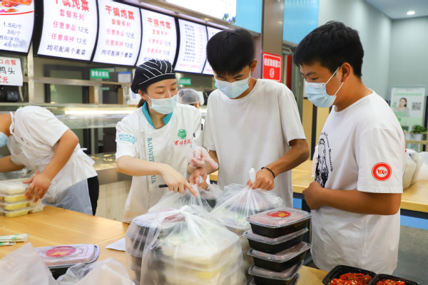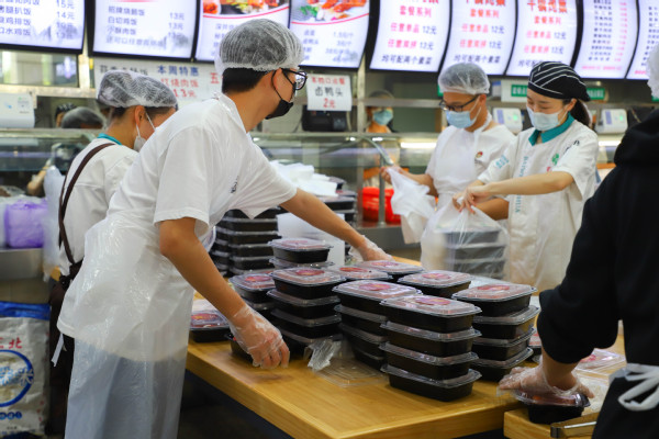图为食堂工作人员正在打包 摄影:杜梦婷