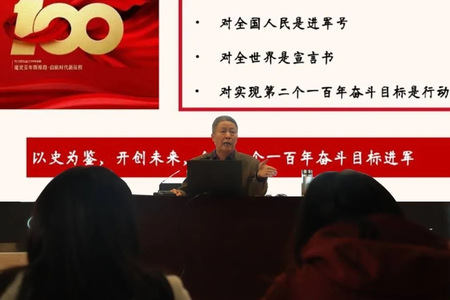 李纪明教授以“以史为鉴 开创未来”为主题,分别围绕“一点认识、两点体会、三点建议”三方面展开讲解,详细深入地向学生们阐述并解读了习近平总书记“七一讲话”的重要意义与深刻内涵。“一点认识”是指关于“七一讲话”的具体认识,它是对全体党员的动员令,是激励全党全国各族人民向第二个百年奋斗目标进军的政治宣言和行动纲领;“两点体会”是关于“七一”重要讲话内容的基本体会,一是成功经验千万条,坚持党的领导头一条,二是赓续红色血脉是每个共产党员的历史责任;“三点建议”是对青年党员的殷切期盼,即:信仰要坚定,意志要坚强,学习要踏实。