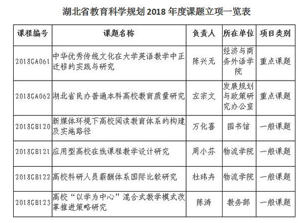 其中,获批的重点课题2项,一般课题4项。经济与商务外语学院陈兴无教授的课题《中华优秀传统文化在大学英语教学中正迁移的实践与研究》和学校校长助理、发展规划与政策研究办公室主任左宗文的课题《湖北省民办普通本科高校教育质量研究》获批重点课题。