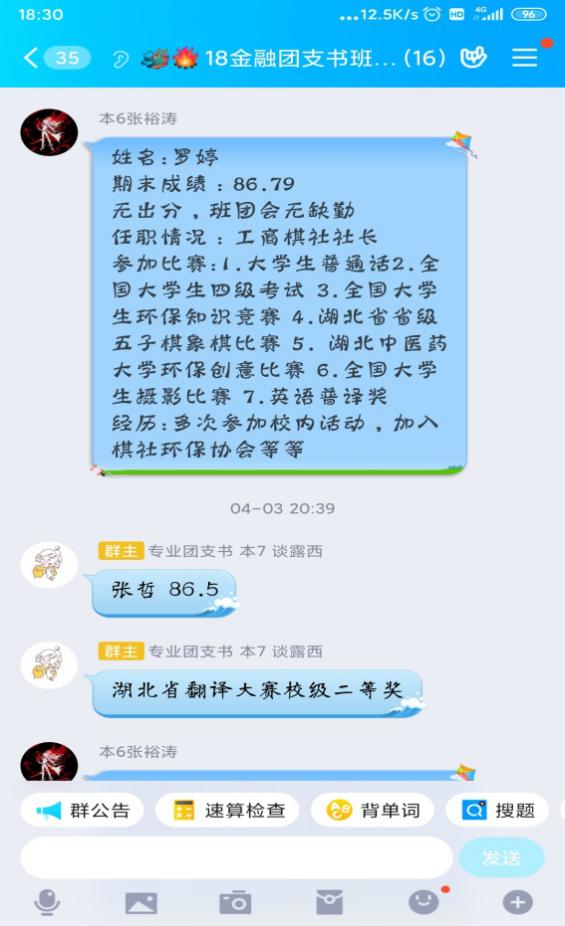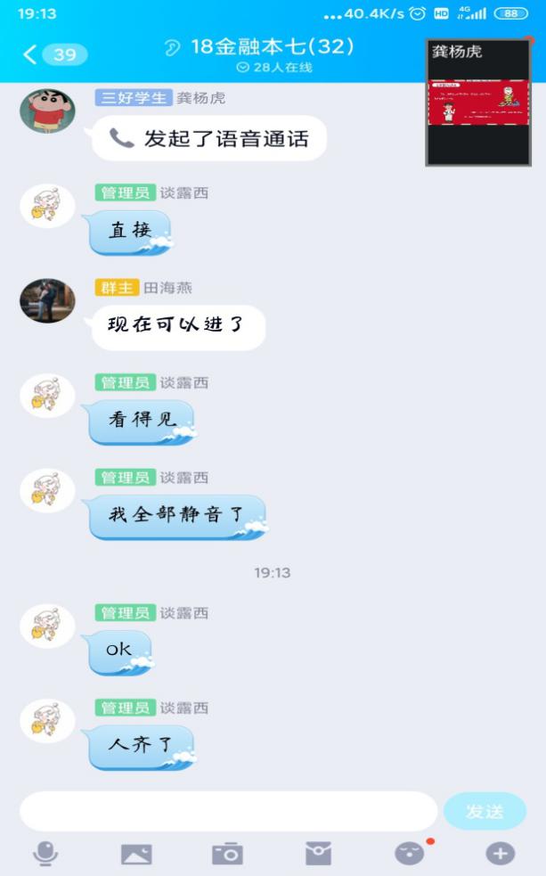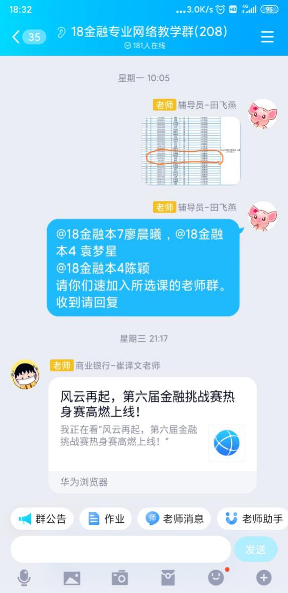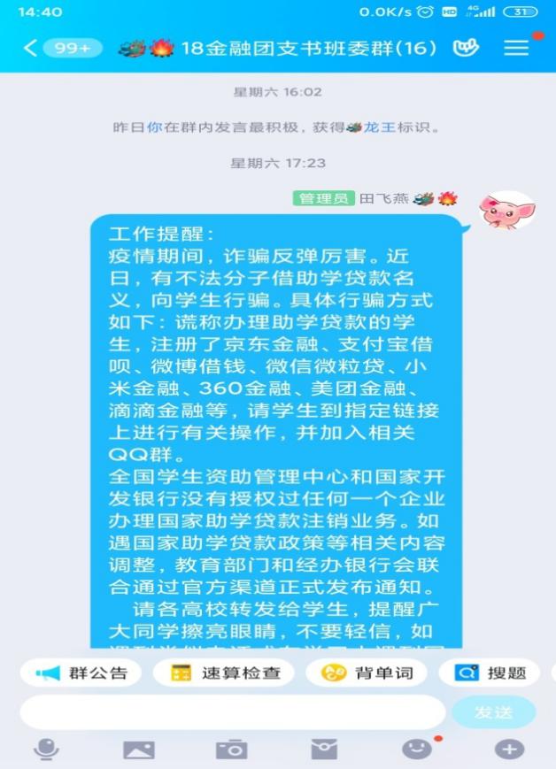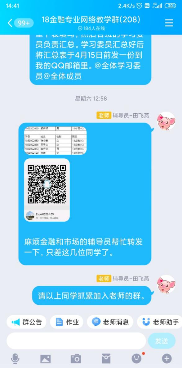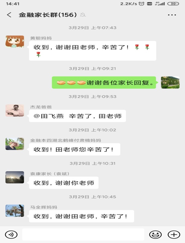 疫情虽然阻断了我和学生如期在学校里相逢,但是没有阻断我们彼此之间的联系。我充分发挥微信平台上的18金融家长群、18金融班委群;利用好QQ平台上18金融专业学生群、18金融专业班委群18金融专业网络教学群,及时发布学校相关的信息传达到每位学生。