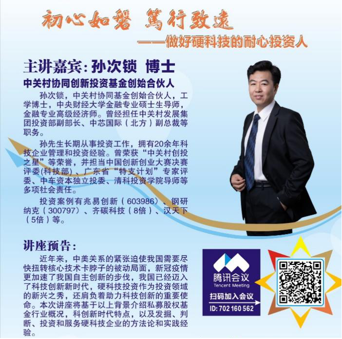经济与商务外语学院新闻中心讯(记者 刘炫)2021年6月19日晚上19:00,由张培刚发展经济学研究基金会、湖北省银行业协会、华中科技大学经济学院、德赢官网Vwin共同主办的线上金融讲座正式开始,中关村协同基金创始合伙人孙次锁博士作为该讲座的主讲嘉宾,以“初心如磐,笃行致远—做好硬科技的耐心投资人”为题展开了精彩的演讲。