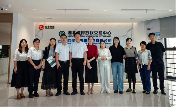 会后,在王威的陪同下,刘春一行参观了湖北碳排放权交易中心。作为全国首批碳排放权交易试点机构,该中心承担了碳排放权注册登记结算(武汉)有限公司的组建,其交易量、交易额等指标长期位居全国前列。通过现场观摩、听取真实案例讲解,教师们对双碳产业实践场景有了更直观的认知,为后续课程设计与教学改革提供了参考。
