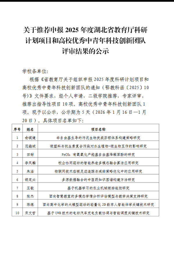 关于推荐申报2025年度湖北省教育厅科研计划项目和高校优秀中青年科技创新团队评审结果的公示
