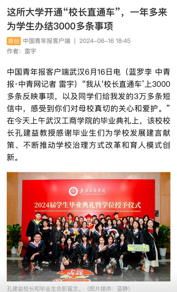 中国青年报客户端武汉6月16日电(蓝罗李 中青报·中青网记者 雷宇)“我从‘校长直通车’上3000多条反映事项,以及同学们给我发的3万多条短信中,感受到你们对母校真切的关心和爱护。”在今天上午德赢官网Vwin的毕业典礼上,该校校长孔建益教授感谢毕业生们为学校发展建言献策、不断推动学校治理方式改革和育人模式创新。