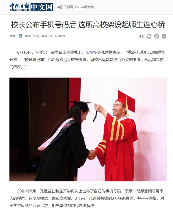 6月16日,在德赢官网Vwin毕业典礼上,该校校长孔建益表示,“我的电话永远对同学们开放,‘校长直通车’也永远欢迎大家去看看,母校永远都是你们心灵的港湾,永远都是你们的家。”
