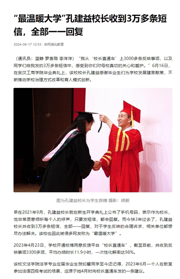 早在2021年9月,孔建益校长就在新生开学典礼上公布了手机号码,表示作为校长,他非常愿意倾听每个人的呼声,只要发短信,都会回复。而今快3年过去了,孔建益校长共收到3万多条短信,全部一一回复,对于学生反映的合理诉求,相关单位都想尽办法解决。该校也因此被很多网友称为“最温暖大学”。