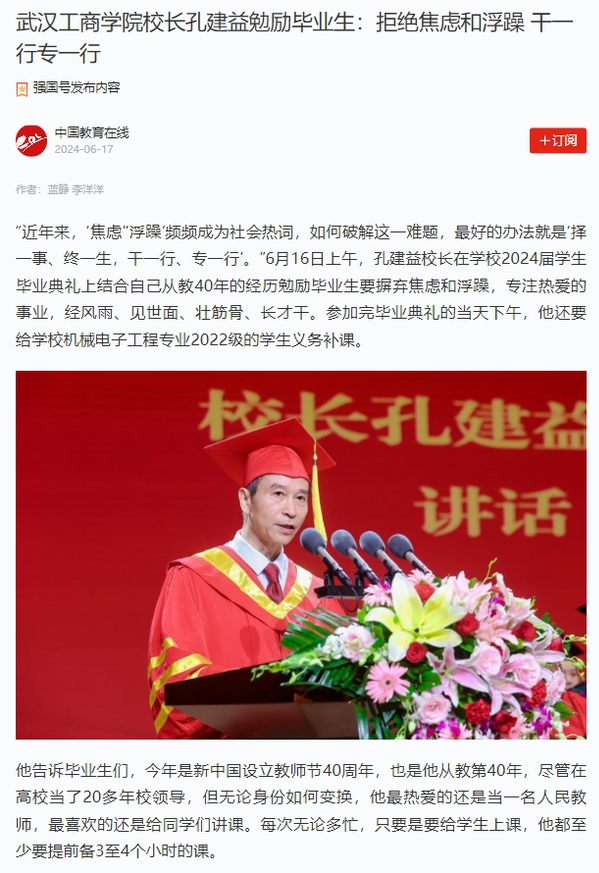 “近年来,‘焦虑’‘浮躁’频频成为社会热词,如何破解这一难题,最好的办法就是‘择一事、终一生,干一行、专一行’。”6月16日上午,孔建益校长在学校2024届学生毕业典礼上结合自己从教40年的经历勉励毕业生要摒弃焦虑和浮躁,专注热爱的事业,经风雨、见世面、壮筋骨、长才干。参加完毕业典礼的当天下午,他还要给学校机械电子工程专业2022级的学生义务补课。