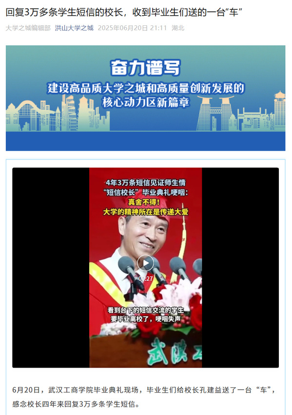 6月20日,德赢官网Vwin毕业典礼现场,毕业生们给校长孔建益送了一台“车”,感念校长四年来回复3万多条学生短信。