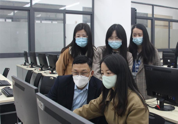 图为周小芬副院长与企业讲师交流课程实训软件的应用 摄影:胡宇航