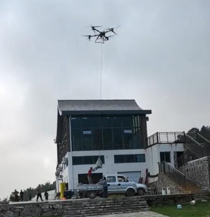 图为花果山水蜜桃种植基地工人利用无人机运输桃子 摄影:苏天琦