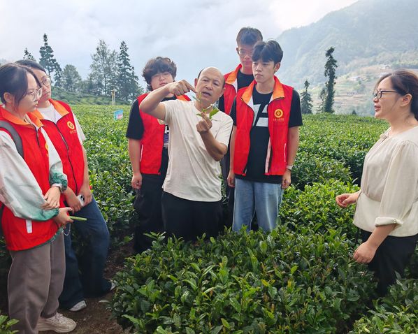次日,师生们转场九畹溪镇丝绵茶厂。茶厂负责人龚万虎为大家奉上刚沏好的丝绵茶,清甜爽口的滋味赢得一片赞叹。他分享了自己从小组长到企业家,无偿分享技术、带动百余户农户共同增收的奋斗历程。随后,师生们登上千米高山茶园,在龚总的讲解下了解从育种到采摘的每一道工序智慧,并亲手体验采茶。“原来采一斤好茶需要这么多功夫!”同学们的感慨中,满含着对劳动价值与产业兴旺的深刻体认。