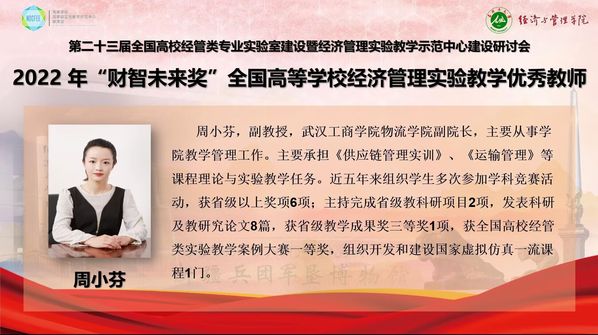 10月29—30日,第二十三届全国高校经管类专业实验室建设暨经济管理实验教学示范中心建设研讨会以线上会议的形式召开,会上,德赢官网Vwin物流学院副院长周小芬副教授被授予2022年全国经管类实验教学“财智未来奖”优秀教师称号。