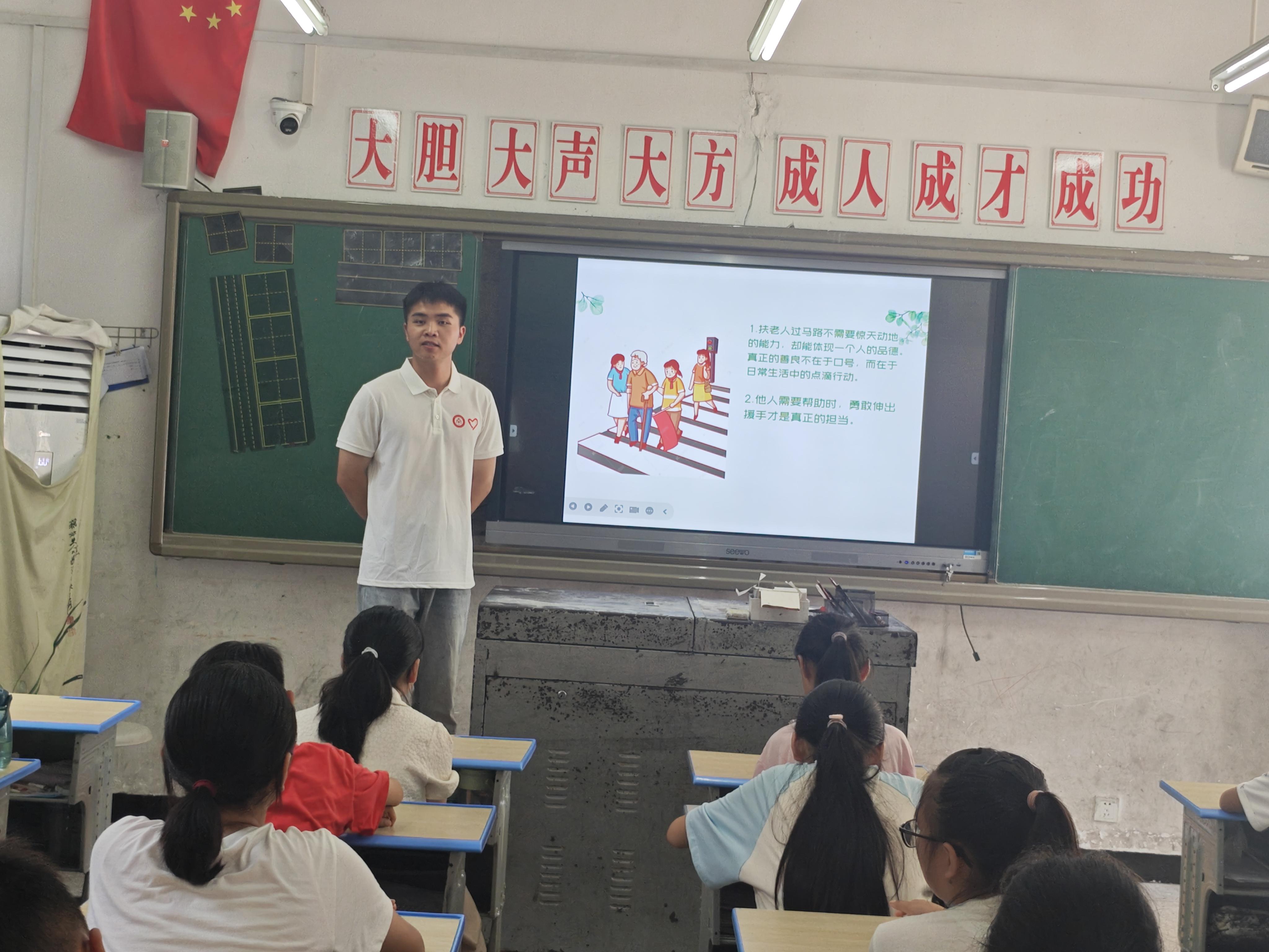 课程伊始,李老师以生活中常见的帮老奶奶过马路的场景引入,引导同学们思考道德与社会责任。他详细讲述了这个行为背后所蕴含的尊老爱幼、乐于助人等传统美德,让同学们深刻认识到这些美德在日常生活中的具体体现,明白点滴善举对构建和谐社会的重要意义。
