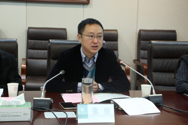 图为张俊副校长介绍学校创新创业教育相关情况 见习摄影:严静静