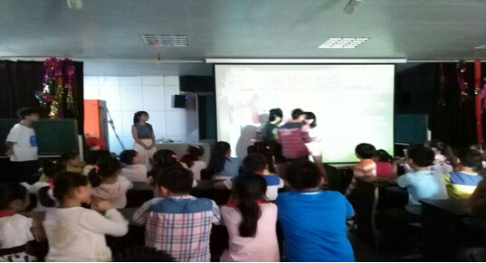 在环境保护协会成员们的演示后,邀请小学生再上台纷纷模拟。小学生们积极踊跃参加,现场气氛十分热烈,讲座进展十分顺利,讲座非常成功。