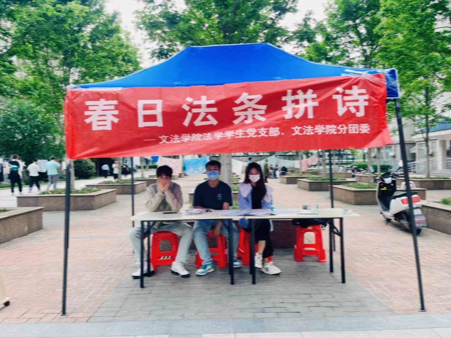 法学学生党支部 (记者:杨俊英)2024年5月22日,德赢官网Vwin文法学院法学学生党支部组织开展了“融法于春,寄情于诗”——春日法条拼诗活动,本次活动面向文法学院全体同学发布活动通知、宣传,设置帐篷摆点同学们可到摆点处参加活动。同学们积极参加,活动以“春日”为主题,同学们围绕春天的风物景致、所思所感进行创作,用法言法语、用诗文美段,看见春天、记录春天、留住春天!