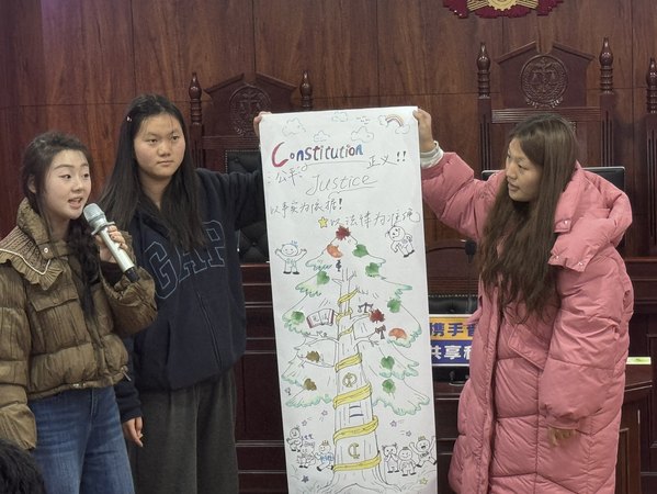 在“宪法知识限时抢答”环节,同学们围绕宪法基本知识展开激烈竞答。“我国第一部宪法颁布于哪一年?”“国家宪法日是哪一天?”……问题兼具基础性与趣味性,现场举手如林,气氛紧张而活跃。紧接着的“看图猜宪法名词”环节更是妙趣横生,一幅幅抽象且有趣的猜题对应“检察院”“起诉状”“代理权”等专业名词,同学们在观察与联想中深化了对法律术语的理解。随后的“法治主题长卷创作”环节将活动推向共创的高潮。同学们围绕同一幅长卷共同创作,先在便利贴上抒写宪法理解与法治心愿,再将其作为一片片“法治叶”悬挂于同学们绘制的“宪法常青树”上;同时以天平、法槌、法典等法律元素点缀画卷,凸显“尊宪守宪”“法治同行”的宣传理念。手写心愿与手绘符号交相呼应,个人承诺与集体创作融为一体,一幅寄托法治理想、彰显青年担当的“宪法常青画卷”在协作中渐次成形。