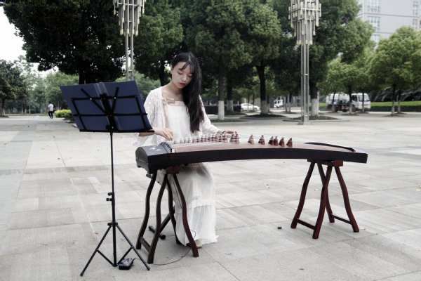 图为学生祝文静正在为快闪话剧弹奏配乐《精忠报国》 摄影:叶炫志