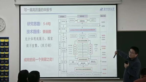 在具体内容上,张洋磊强调人文社科选题需高度契合政策导向,关注“新质生产力”“教育科技人才一体”等新提法与前沿方向。他建议教师动笔前广泛阅读中英文文献,结合自身研究基础与申报单位实际谋划选题。同时,他详细阐述了课题名称拟定、研究思路梳理、技术路线设计、创新点提炼等关键要点,特别指出研究思路要高度凝练,技术路线图要简而精,创新点需清晰归纳且不夸大,重难点要区分意义价值与方法数据维度。