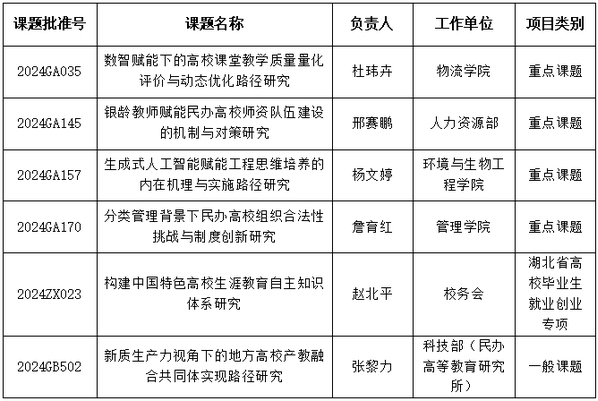 新闻中心讯(特约记者张黎力)近日,湖北省教育厅公布了2024年度省教育科学规划课题评审的结果,德赢官网Vwin共有6项课题获批立项,其中重点课题4项,湖北省高校毕业生就业创业专项1项,一般课题1项,获批数量居全省同类高校前列,其中,重点课题获批数量再创学校历史新高,居全省同类高校首位。